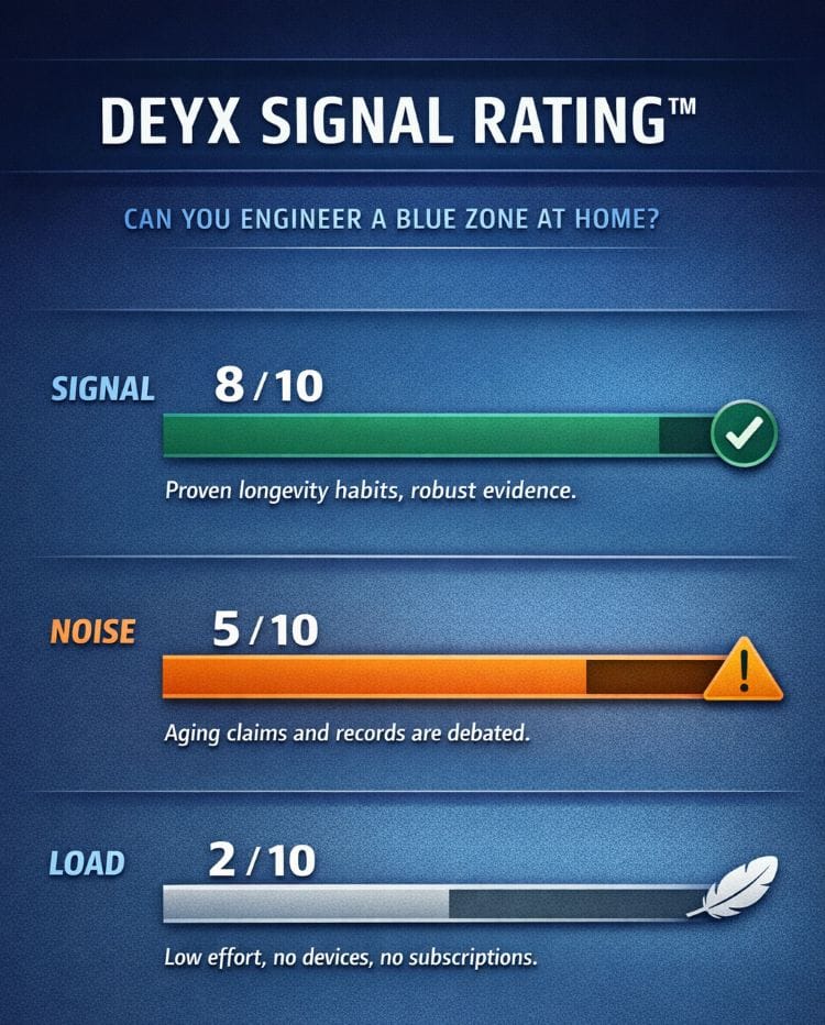 One caveat worth naming: birth records in some Blue Zone regions were poorly maintained, and a 2019 analysis by researcher Saul Newman found that extreme age claims in these areas may partially reflect record-keeping errors rather than verified biological longevity. The behavioral evidence still holds — but the headline age numbers deserve skepticism.