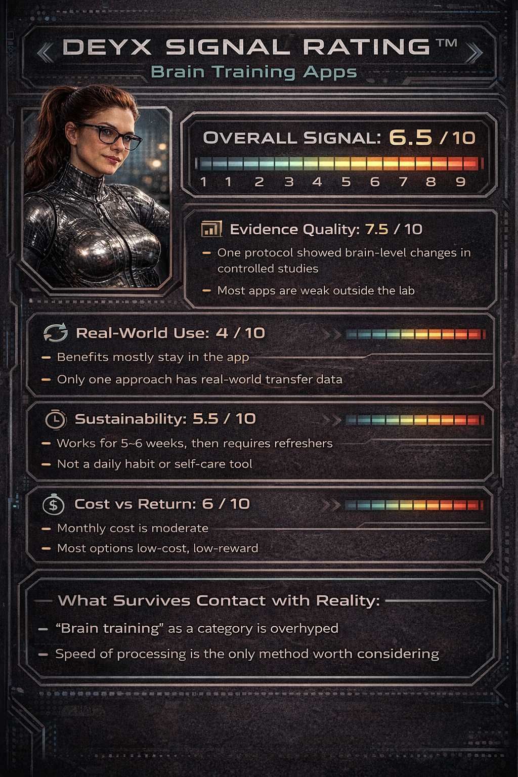 Speed-based brain training, done consistently and with periodic refresher sessions, carries the strongest evidence in the brain training market. BrainHQ runs that exact protocol. Everything else works as a daily mental habit, not a clinical tool.